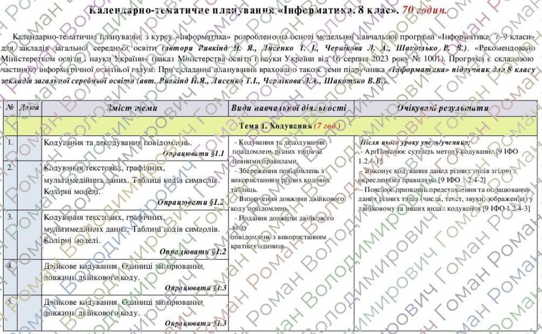 Календарно-тематичне планування з «Інформатики” на 2025-2026 навчальний рік. 8 клас. 70 годин. НУШ. За модельною програмою авторів Ривкінд Й., Лисенко