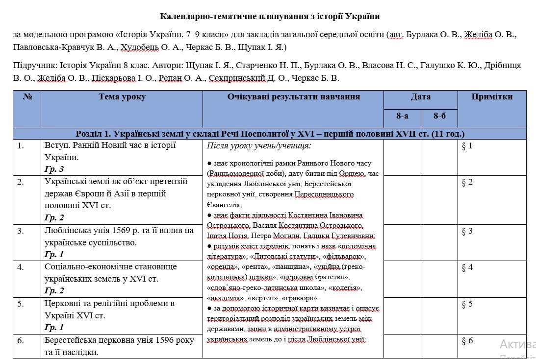 Календарно-тематичне планування “Історія України. 8 клас” НУШ (до підручника Щупак...