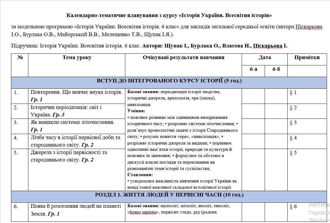 Календарно-тематичне планування «Історія України. Всесвітня історія”. 6 клас. 105 годин. З ...
