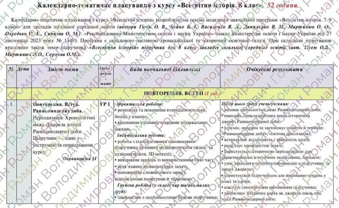 Календарно-тематичне планування з Всесвітньої історії. 8 клас. 52 години. З групами результатів. НУШ. За підручником Гісем О., Мартинюк О. та модельн