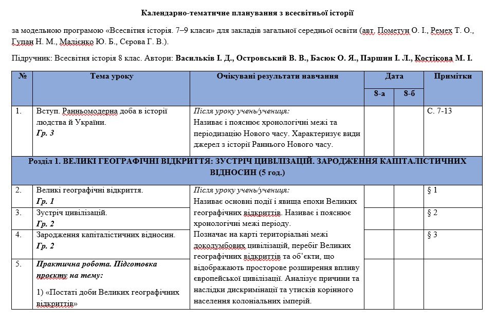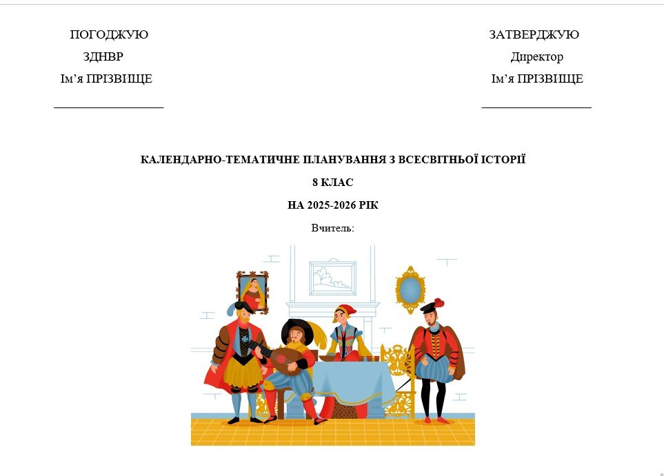 Синхронізоване календарно-тематичне планування з всесвітньої історії та історії України 8 клас (О...