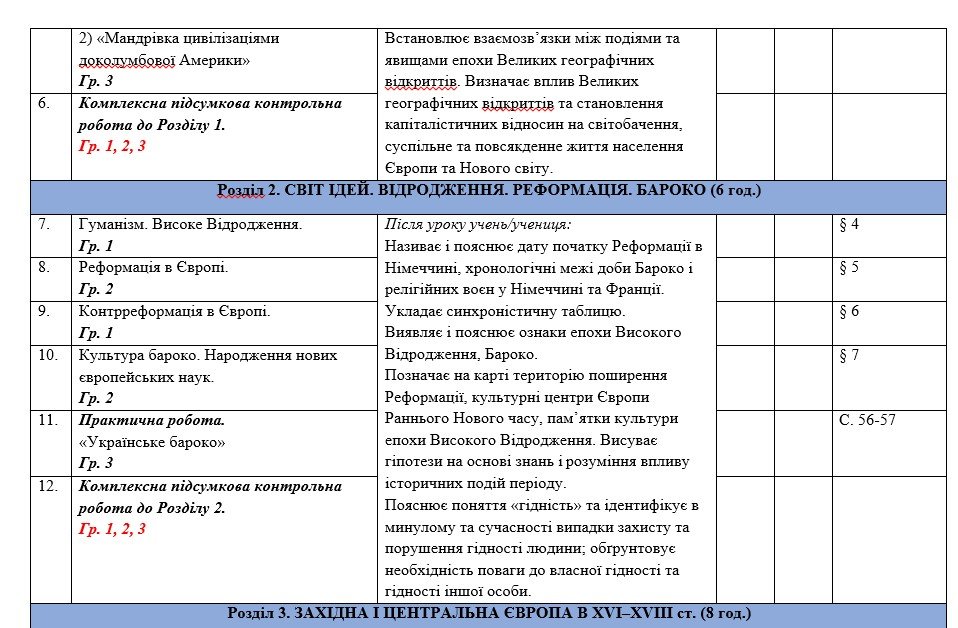 Синхронізоване календарно-тематичне планування з всесвітньої історії та історії України 7 клас (О...