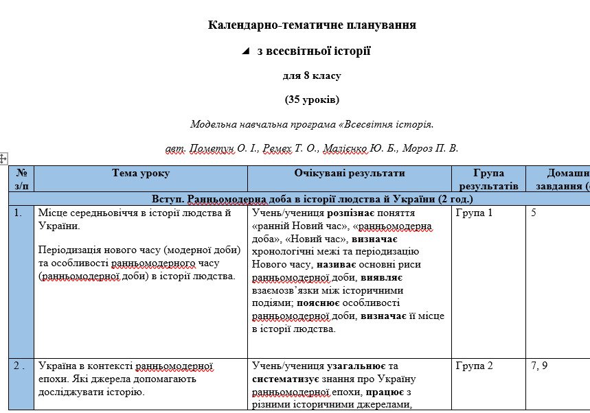 Синхронізоване календарно-тематичне планування з всесвітньої історії та історії України 8 клас (О...