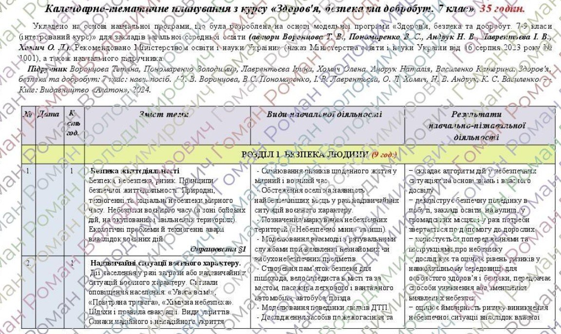 Коли я отримаю матеріал «Календарно-тематичне планування «Здоров’я, безпека та добробут”. 7 клас. 35 годин. НУШ. За підручником Воронцова Т. та модельною програмою авторів Вор»?