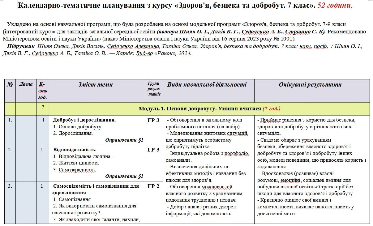 Календарно-тематичне планування «Здоров’я, безпека та добробут”. 7 клас. 52 години. З групами результатів. За підручником Шиян О. та модельною програ