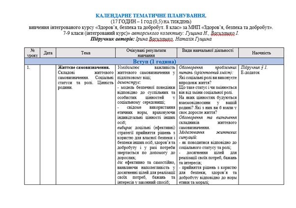 вивчення інтегрованого курсу «Здоров’я, безпека та добробут. 8 клас» за МНП «Здоров’я, безпека та добробут». 7-9 класи (інтегрований курс)»авторського колективу: Гущина Н., Василашко І.