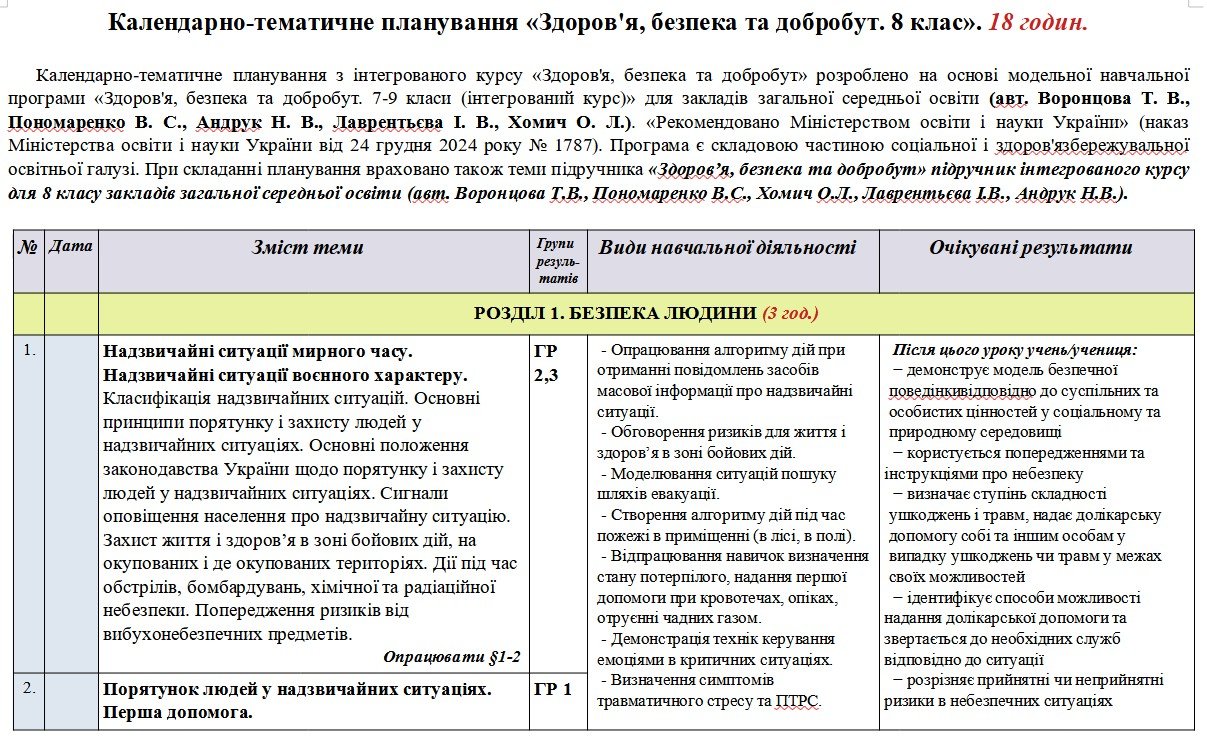 Календарно-тематичне планування з інтегрованого курсу «Здоров’я, безпека та добробут» розроблено на основі модельної навчальної програми «Здоров’я, безпека та добробут. 7-9 класи (інтегрований курс)» для закладів загальної середньої освіти (авт. Воронцова Т. В., Пономаренко В. С., Андрук Н. В., Лаврентьєва І. В., Хомич О. Л.). «Рекомендовано Міністерством освіти і науки України» (наказ Міністерства освіти і науки України від 24 грудня 2024 року № 1787). Програма є складовою частиною соціальної і здоров’язбережувальної освітньої галузі. При складанні планування враховано також теми підручника «Здоровʼя, безпека та добробут» підручник інтегрованого курсу для 8 класу закладів загальної середньої освіти (авт. Воронцова Т.В., Пономаренко В.С., Хомич О.Л., Лаврентьєва І.В., Андрук Н.В.).