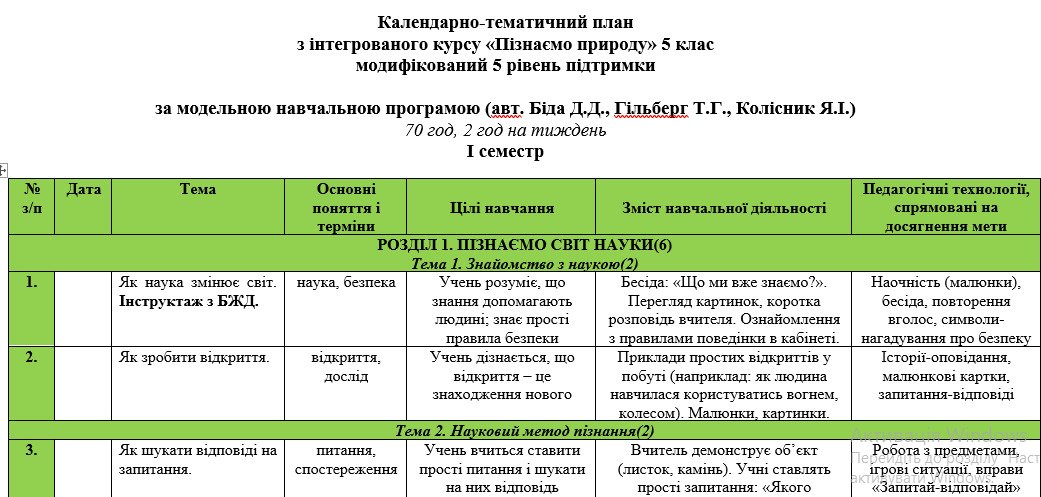 Календарно-тематичне планування з групами результатів для 5 класу з курсу “Пізнаємо природу...