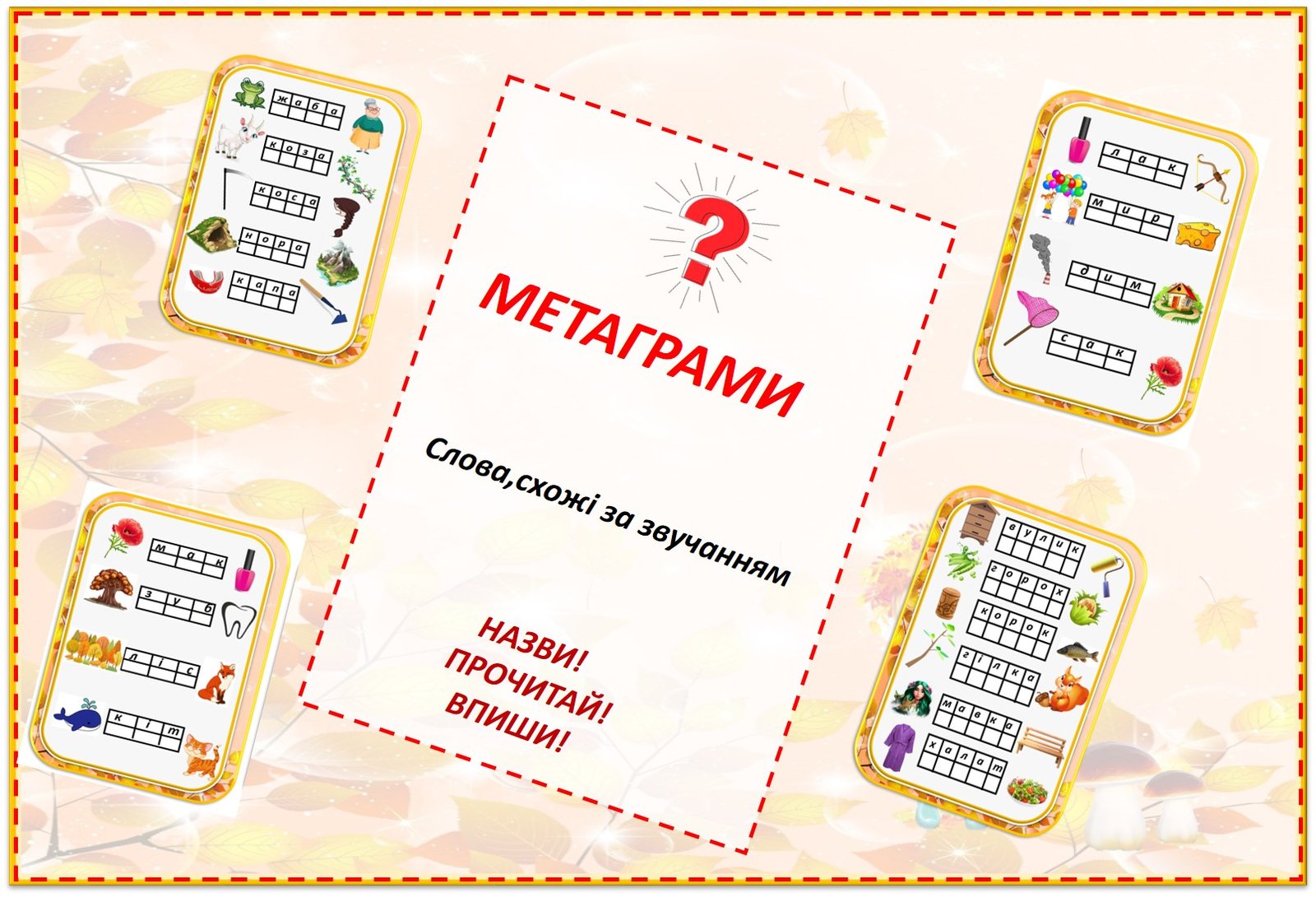 Перелік матеріалів: 1.Робочі картки для швидкого розчитування слів-12 слайд. 2.Метаграми-3-слайд. 3.Метаграми”Зміни літеру”-5 слайд. 4.Титулка .Мета.Опис гри.