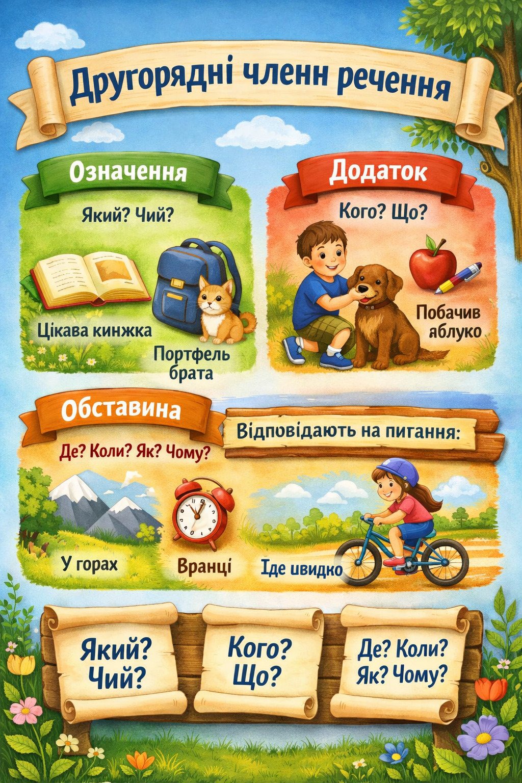 Матеріал презентації у казковій формі пояснює структуру речення, де головними героями виступають підмет і присудок, а їхніми помічниками — другорядні члени. Описано роль додатка, який за допомогою непрямих відмінків вказує на об’єкти дії та позначається пунктиром. Означення змальоване як стиліст, що додає описам барв, відповідаючи на питання «який?», підкреслюємо хвилястою лінією. Мандрівна обставина розкриває деталі місця, часу та способу дії, використовуючи для виділення штрих-пунктир. Завдяки цим компонентам прості речення стають розгорнутими, змістовними та емоційно насиченими. Такий художній підхід допомагає легше засвоїти граматичні правила та функції кожного другорядного члена речення.