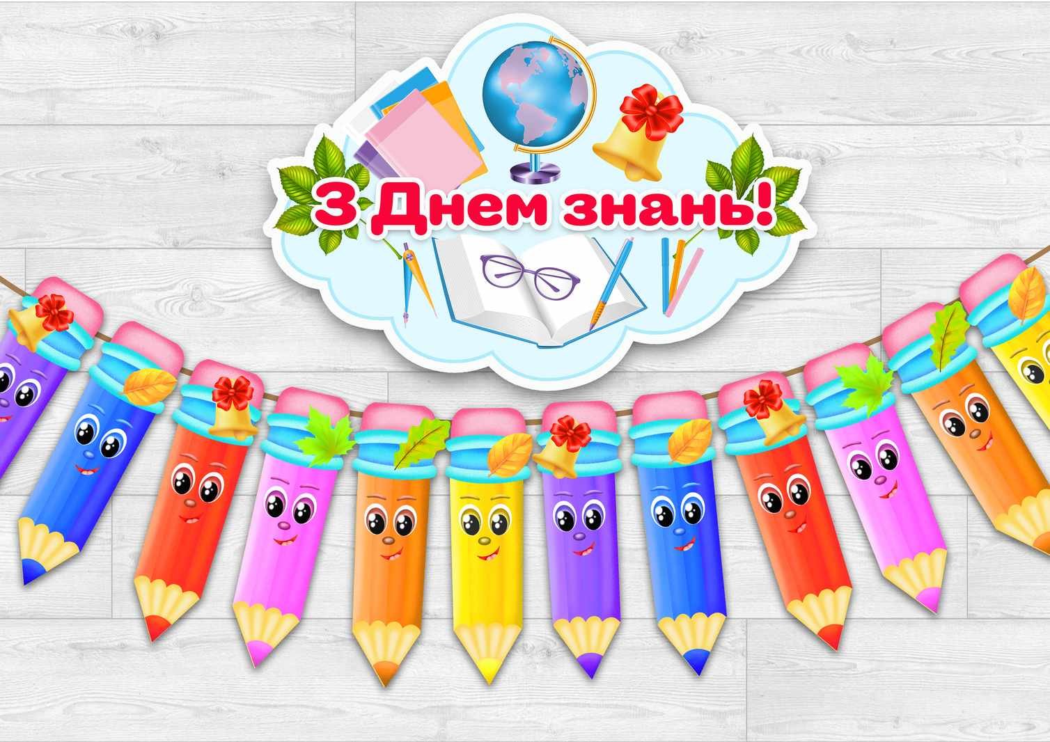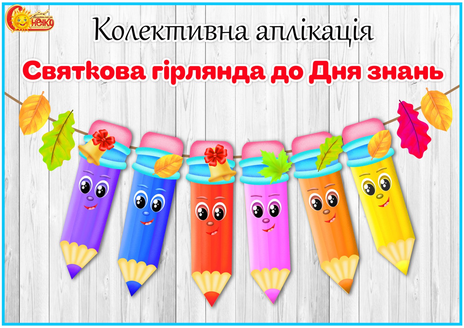 Мета: ознайомити дітей з особливим святом для українців — Днем знань; формувати уявлення про значення цього дня, традиції святкування 1-го вересня; вчити дітей виготовляти спільну гірлянду з паперових, кольорових олівців; закріпити навички вирізання за контуром, приклеювання деталей та дотримання безпечної роботи з ножицями; розвивати дрібну моторику, точність рухів, творчі здібності; виховувати самостійність, радість від участі в спільній творчості.