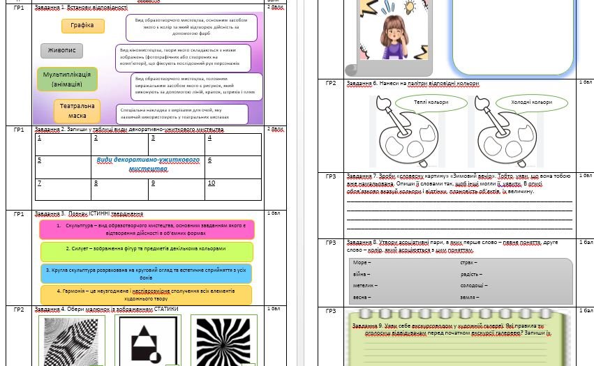 - Завдання естетично оформлені в кольорах, що мотивує учнів до цікавої роботи