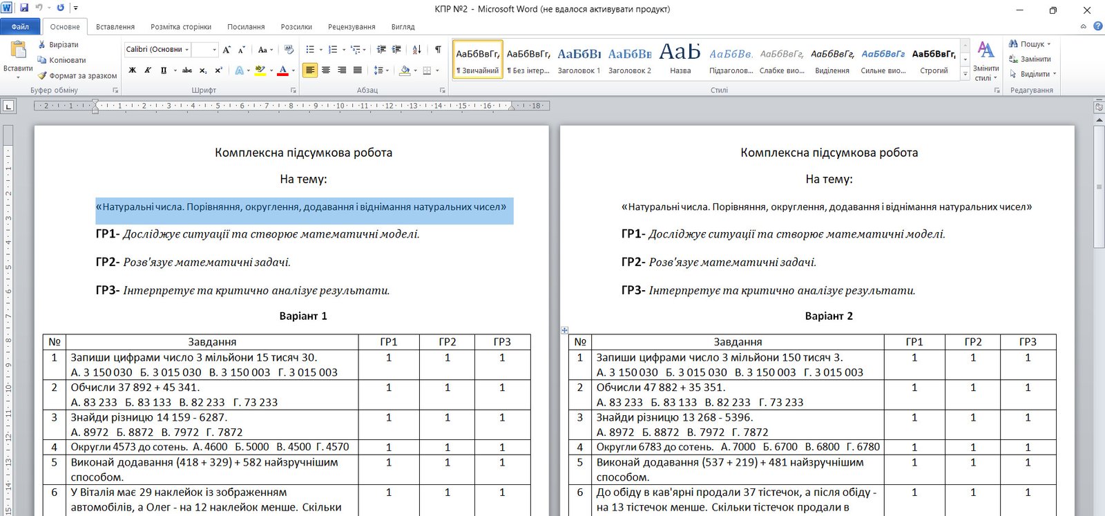 Комплексна підсумкова робота №2 На тему: «Натуральні числа. Порівняння, округлення, додавання і віднімання натуральних чисел»