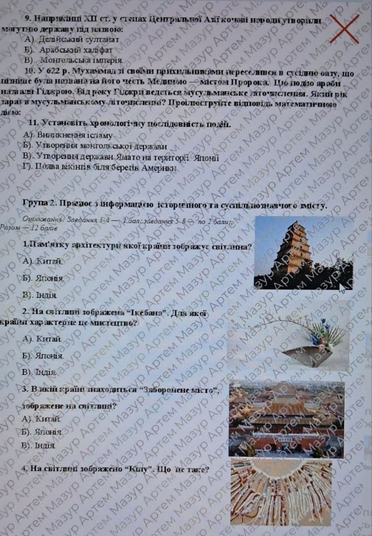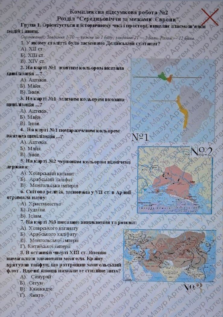 Діагностувальна робота. Розділ №2. Середньовіччя за межами Європи. 7 клас. 1 варіант. Щупак І.
