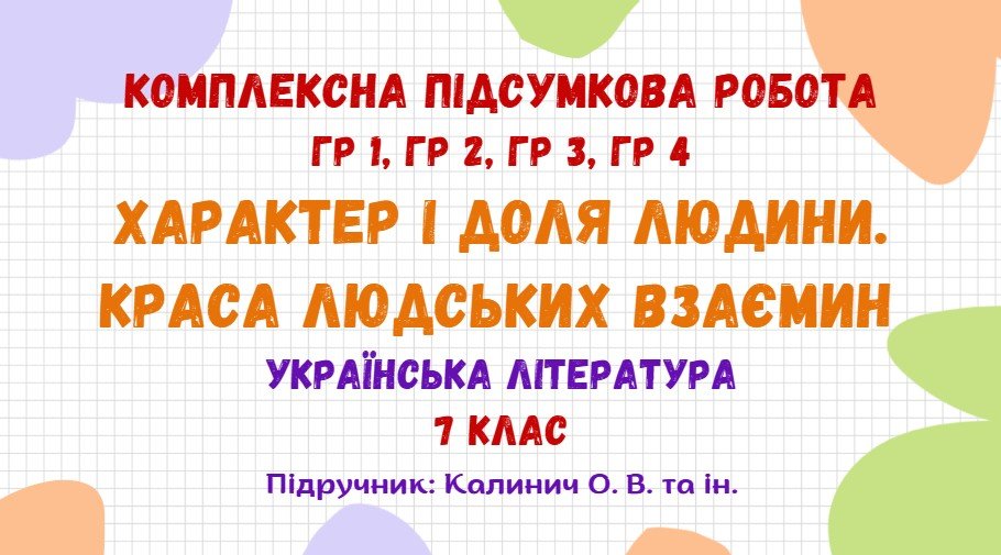 Матеріали «Комплексна підсумкова робота №3. Характер і доля людини. Краса людських взаємин. Українська література. 7 клас НУШ (підручник: Калинич О. В. та ін.)» будуть надіслані в електронному вигляді на вашу поштову скриньку одразу після оплати.