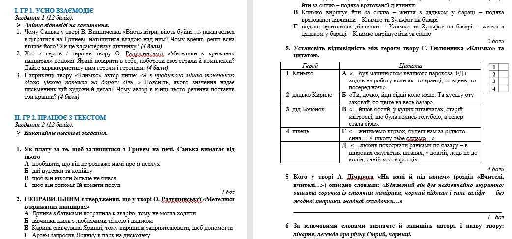 Комплексна підсумкова робота з української літератури розроблена для учнів 7 класу, які вивчили тему “Характер і доля людини. Краса людських взаємин“ (модельна навчальна програма «Українська література. 7–9 класи» для закладів загальної середньої освіти (автори: Яценко Т. О., Пахаренко В. І., Слижук О. А., Тригуб І. А.)).