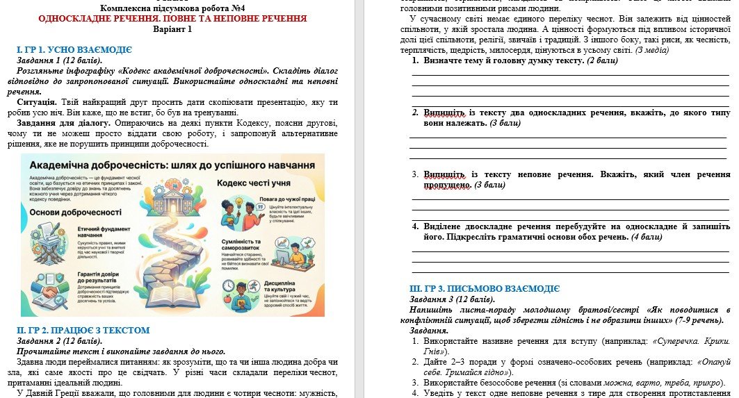 Комплексна підсумкова робота з української мови розроблена для учнів 8 класу, які вивчили тему “Односкладне речення. Повне та неповне речення“ (модельна навчальна програма «Українська мова. 7-9 класи» для закладів загальної середньої освіти (автори: Заболотний О. В., Заболотний В. В., Лавринчук В. П., Плівачук К. В., Попова Т. Д.)). 2 варіанти. ЧОТИРИ ГРУПИ РЕЗУЛЬТАТІВ. ГР 1. Усно взаємодіє – діалог на основі інфографіки. ГР 2. Працює з текстом – 4 завдання. ГР 3. Письмово взаємодіє – творча робота. ГР 4. Досліджує мовлення – 11 тестових завдань.