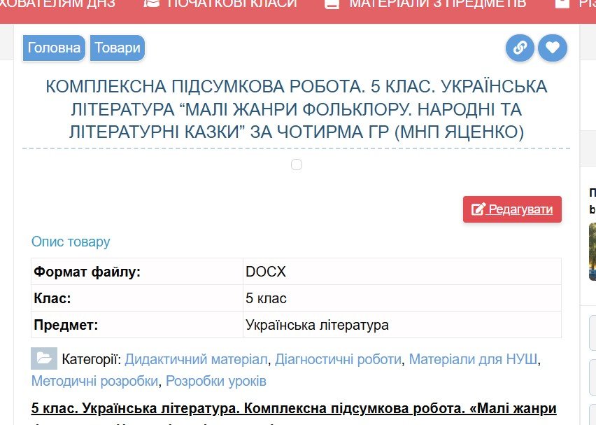 Як купити матеріал «Комплексна підсумкова робота. 5 клас. Українська література “Малі жанри фольклору. Народні та літературні казки” за чотирма ГР (МНП Яценко) 2 варіанти»?