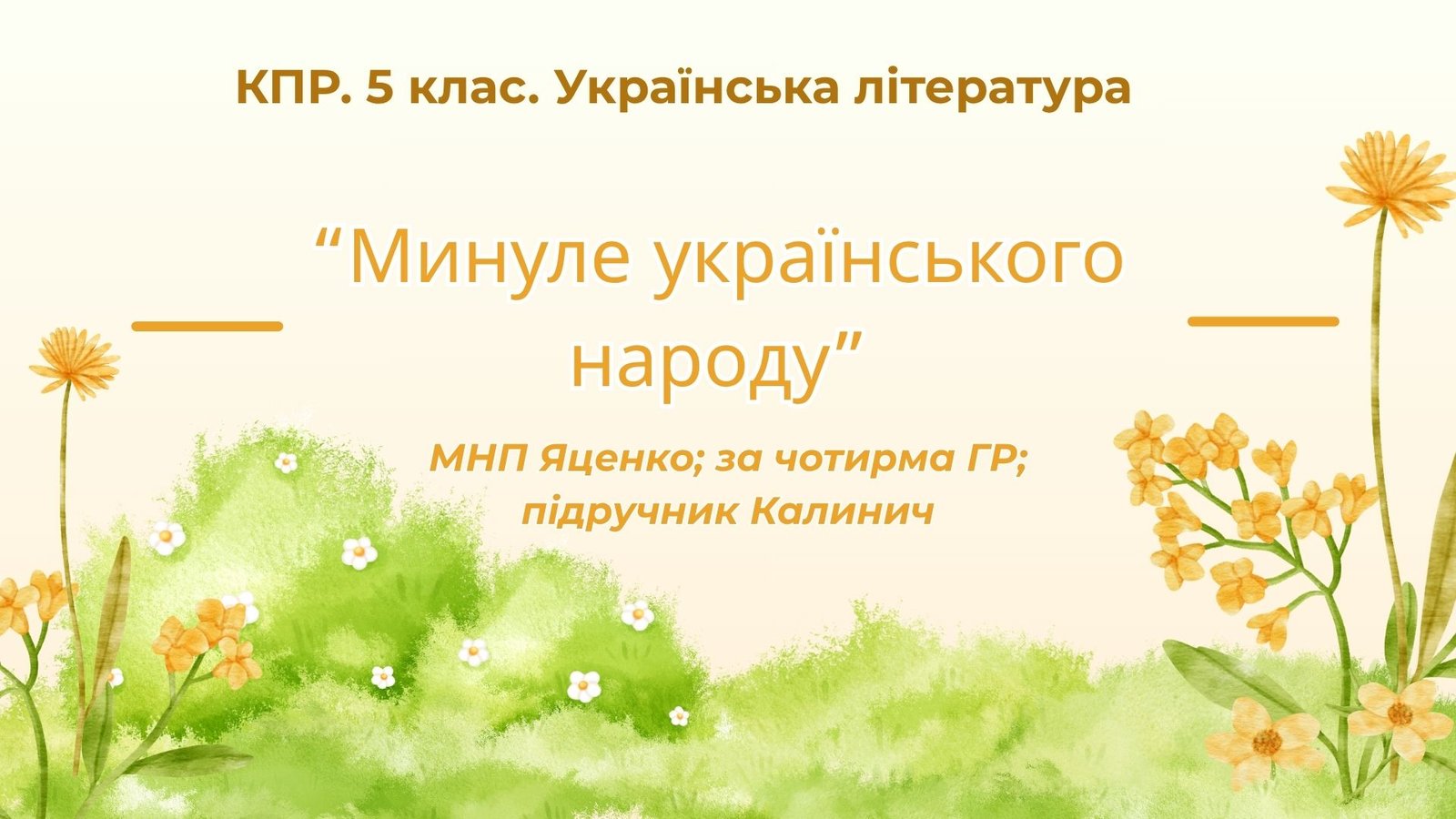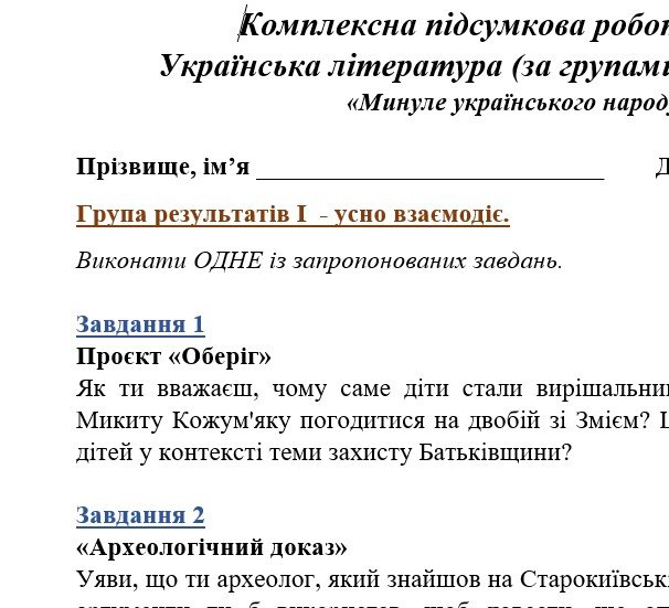 Комплексна підсумкова робота. 5 клас. Українська література “Минуле українського народу” за чотирма ГР (МНП Яценко; підручник Калинич)
