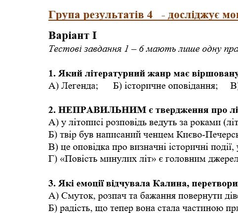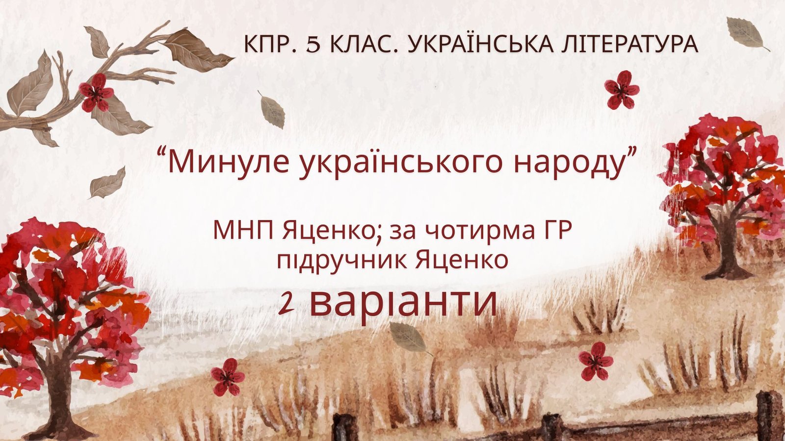 Комплексна підсумкова робота. 5 клас. Українська література “Минуле українського народу” за чотирма ГР (МНП Яценко; підручник Яценко) 2 варіанти