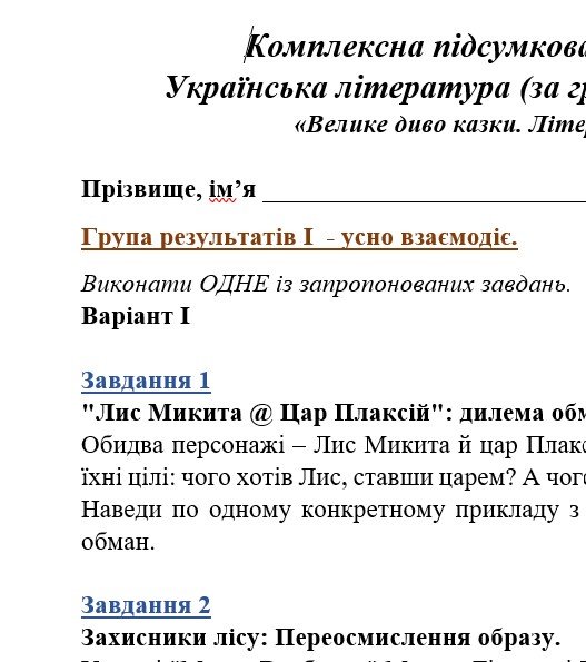 Комплексна підсумкова робота. 5 клас. Українська література “Велике диво казки. Літературні казки” за чотирма ГР (МНП Архипової) 2 варіанти