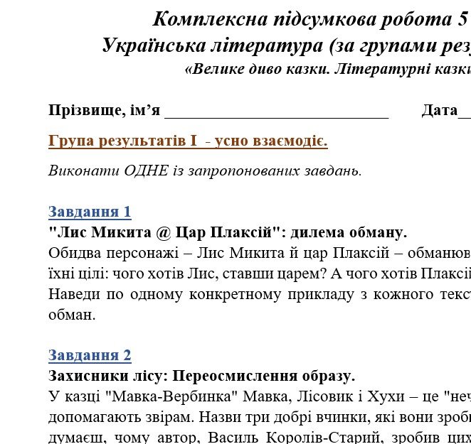 Комплексна підсумкова робота. 5 клас. Українська література “Велике диво казки. Народні каз...