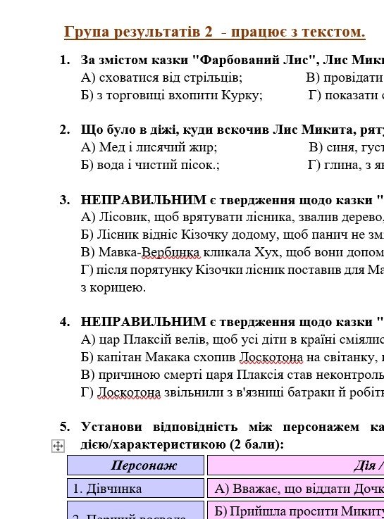 ГР 2. Підсумкова (діагностична) робота. 5 клас. Українська література “Велике диво казки. Н...