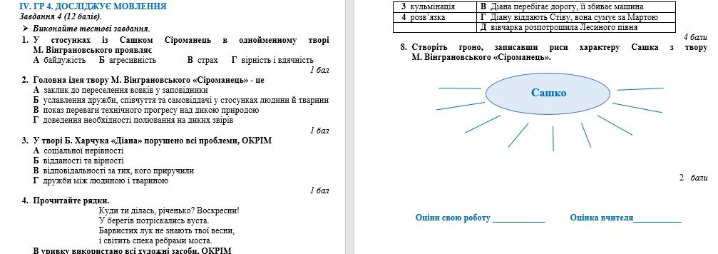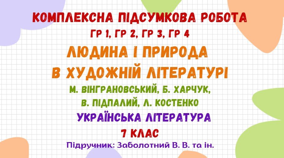Комплексна підсумкова робота з української літератури розроблена для учнів 7 класу, які вивчили тему “ЛЮДИНА І ПРИРОДА В ХУДОЖНІЙ ЛІТЕРАТУРІ. М. Вінграновський, Б. Харчук, В. Підпалий, Л. Костенко” (модельна навчальна програма «Українська література. 7–9 класи» для закладів загальної середньої освіти (автори: Заболотний О. В., Слоньовська О. В., Ярмульська І. В.)).