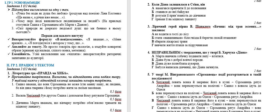 2 варіанти. ЧОТИРИ ГРУПИ РЕЗУЛЬТАТІВ. ГР 1. Усно взаємодіє – висловлення на одну із трьох запропонованих тем. ГР 2. Працює з текстом – літературна гра “ПРАВДА чи ХИБА”, 6 тестових завдань. ГР 3. Письмово взаємодіє – написання фанфіку на одну із запропонованих тем. ГР 4. Досліджує мовлення – 8 тестових завдань закритого та відкритого типу.