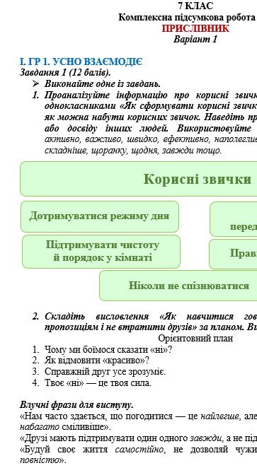 Комплексна підсумкова робота з української мови розроблена для учнів 7 класу, які вивчили тему “Прислівник“ (модельна навчальна програма «Українська мова. 7-9 класи» для закладів загальної середньої освіти (автори: Заболотний О. В., Заболотний В. В., Лавринчук В. П., Плівачук К. В., Попова Т. Д.)). 2 варіанти. ЧОТИРИ ГРУПИ РЕЗУЛЬТАТІВ. ГР 1. Усно взаємодіє – складання діалогу на основі опорної схеми або висловлення за планом (на вибір). ГР 2. Працює з текстом – 5 завдань відкритого типу. ГР 3. Письмово взаємодіє – написання реклами або вільного есе (на вибір). ГР 4. Досліджує мовлення – 9 тестових завдань закритого та відкритого типу.