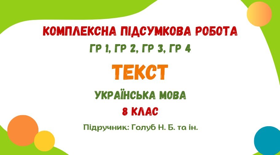 Комплексна підсумкова робота з української мови розроблена для учнів 8 класу, які вивчили тему “Текст“ (модельна навчальна програма «Українська мова. 7-9 класи» для закладів загальної середньої освіти (автори: Голуб Н.Б., Горошкіна О.М.)). 2 варіанти. ЧОТИРИ ГРУПИ РЕЗУЛЬТАТІВ. ГР 1. Усно взаємодіє – аудіювання/переказ тексту/висловлення (1 завдання на вибір). ГР 2. Працює з текстом – 4 завдання для аналізу тексту. ГР 3. Письмово взаємодіє – творча робота (3 варіанти на вибір). ГР 4. Досліджує мовлення – 9 тестових завдань.