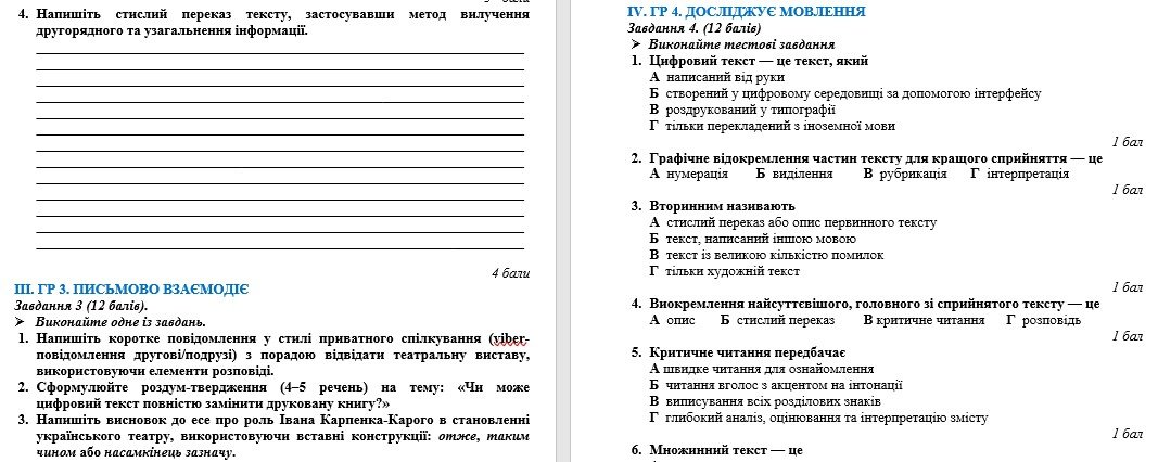 У комплекті є відповіді, критерії оцінювання, самооцінювання.