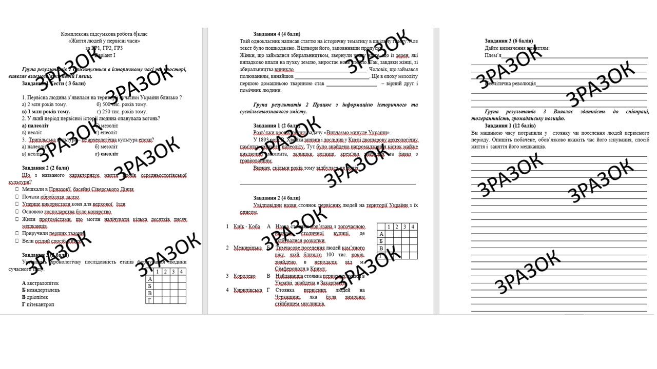 Комплексна підсумкова робота 6 клас Пометун «Життя людей у первісні часи» за ГР1, ГР2, ГР3