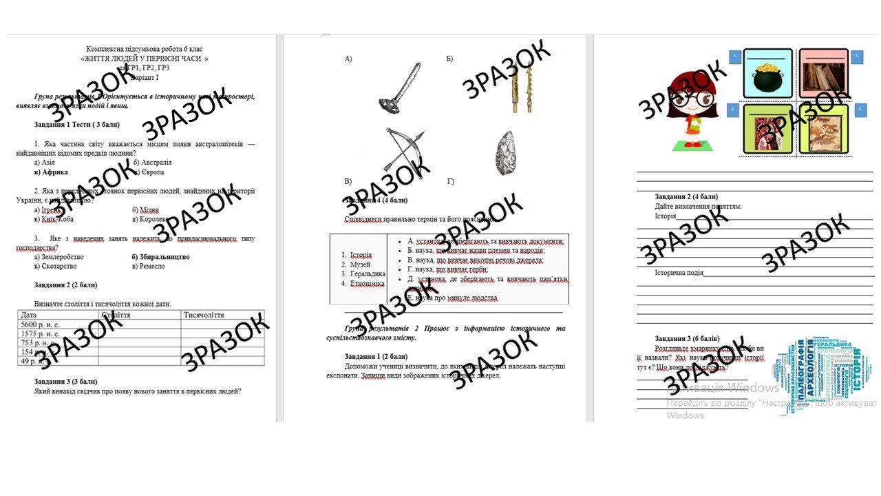 Комплексна підсумкова робота 6 клас Щупак «ЖИТТЯ ЛЮДЕЙ У ПЕРВІСНІ ЧАСИ. » за ГР1, ГР2, ГР3