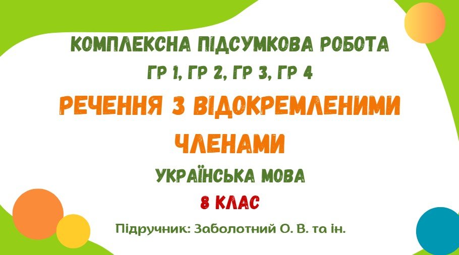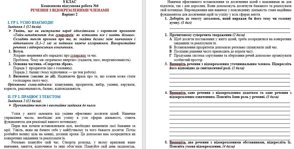 Комплексна підсумкова робота з української мови розроблена для учнів 8 класу, які вивчили тему “Речення з відокремленими членами“ (модельна навчальна програма «Українська мова. 7-9 класи» для закладів загальної середньої освіти (автори: Заболотний О. В., Заболотний В. В., Лавринчук В. П., Плівачук К. В., Попова Т. Д.)). 2 варіанти. ЧОТИРИ ГРУПИ РЕЗУЛЬТАТІВ. ГР 1. Усно взаємодіє – висловлення / промова. ГР 2. Працює з текстом – 5 завдань. ГР 3. Письмово взаємодіє – допис для соцмережі. ГР 4. Досліджує мовлення – 9 тестових завдань.