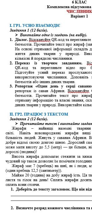 Комплексна підсумкова робота з української мови розроблена для учнів 6 класу, які вивчили тему “Числівник“ (модельна навчальна програма «Українська мова. 5-6 класи» для закладів загальної середньої освіти (автори: Заболотний О. В., Заболотний В. В., Лавринчук В. П., Плівачук К. В., Попова Т. Д.)). 2 варіанти. ЧОТИРИ ГРУПИ РЕЗУЛЬТАТІВ. ГР 1. Усно взаємодіє – діалог, переказ із творчим завданням, репортаж (одне завдання на вибір). ГР 2. Працює з текстом – 5 завдань. ГР 3. Письмово взаємодіє – написання есе, пам’ятки, допису для екоблогу (одне завдання на вибір). ГР 4. Досліджує мовлення – 9 тестових завдань закритого та відкритого типу.