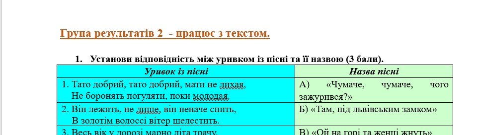 Комплексна підсумкова робота. 7 клас. Українська література. “Пісенна лірика” за чоти...