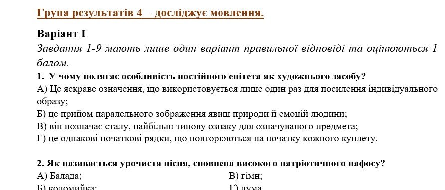 Комплексна підсумкова робота. 7 клас. Українська література. “Пісенна лірика” за чотирма ГР! (МНП Яценко; підручник Авраменка)