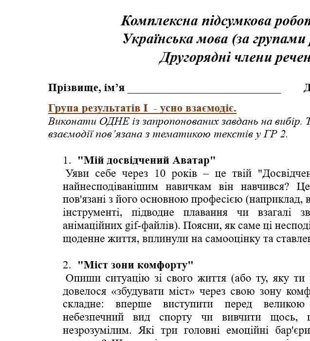 Комплексна підсумкова робота. 8 клас. Українська мова. “Другорядні члени речення” за чотирма ГР!!! (МНП Голуб) 2 варіанти