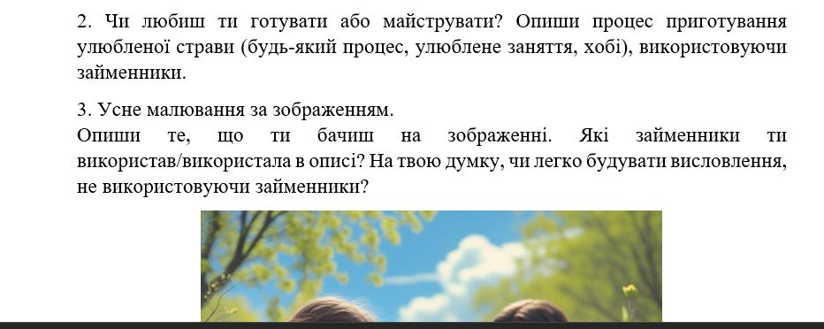УВ – три завдання на вибір учителя/учительки: висловлення-відмова про участь у діях, що маже мати негативні наслідки, опис улюбленого процесу праці, усне малювання за зображенням.