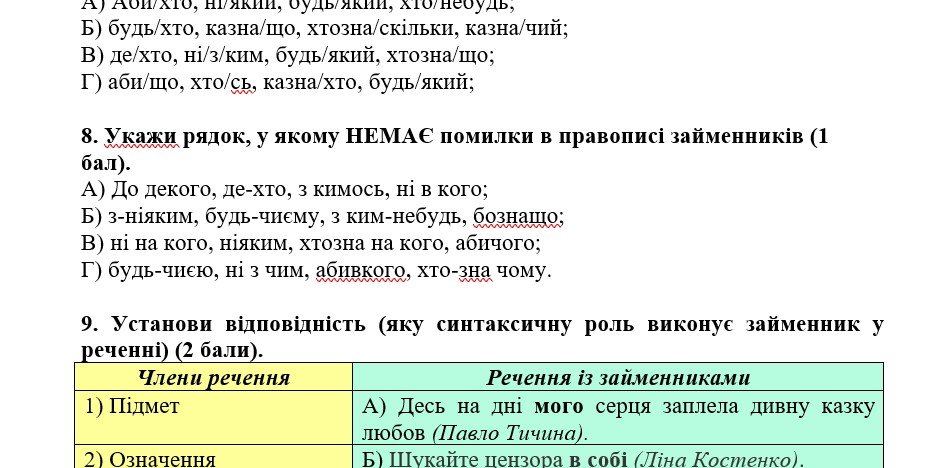 6 клас. Українська мова. Комплексна підсумкова робота з української мови «Займенник» за чотирма групами результатів (УВ, ПТ, ПВ, ДМ). Кожну групу результатів можна оцінити від 1 до 12 балів. Учитель/учителька може проводити роботу як за всіма групами результатів, так і за одним або декількома (в залежності від обраної моделі оцінювання здобувачів освіти).
