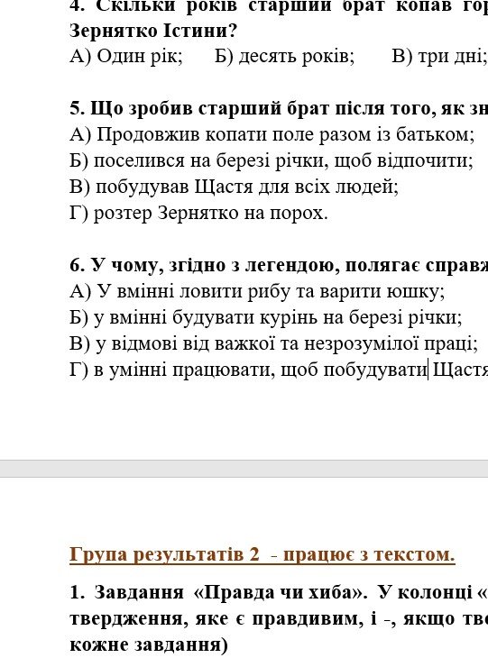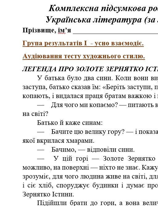 - ГР 1 – аудіювання тексту художнього стилю (легенда Про золоте зернятко істини);