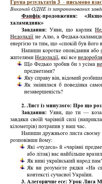 - ГР 3 – ТРИ завдання для письмової взаємодії на вибір (написання креативних творчих робіт – “Якщо б Недоладію відвідав Федько-халамидник», “Лист із минулого: Про що розкаже козак?”, “Алегоричне есе: Урок Лиса Микити”);