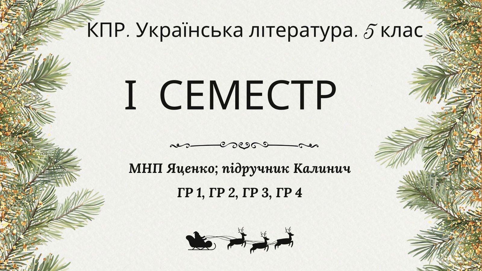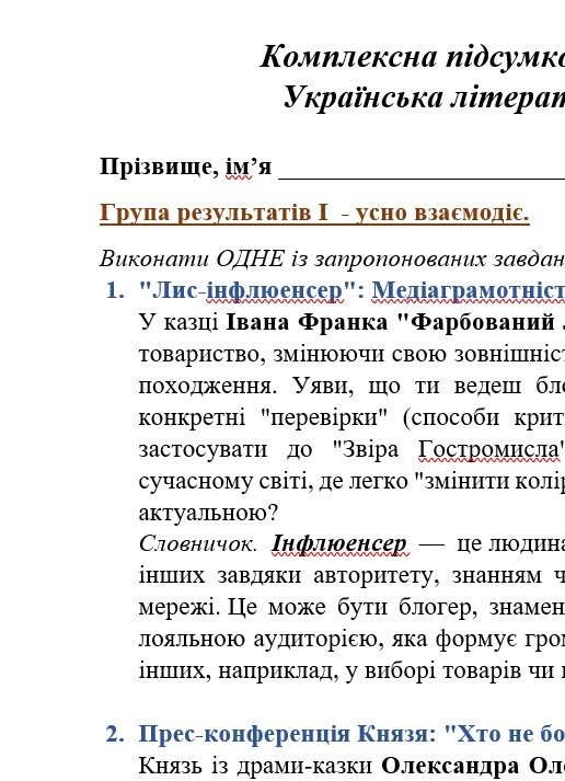 Комплексна підсумкова робота з української літератури для 5 класу ГР 1, ГР 2, ГР 3, ГР 4 за МНП Яценко, підручник Калинич. ЗА ПЕРШИЙ СЕМЕСТР!!!!!! КПР охоплює розділи “Малі жанри фольклору та літератури”, “Народні та літературні казки”, “Минуле українського народу”.