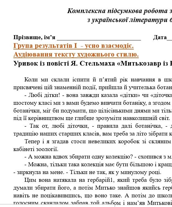 - ГР 1 – аудіювання тексту художнього стилю (уривок із повісті Я. Стельмаха “Митькозавр із Юрківки…”.) або три цікаві креативні завдання для усної взаємодії на вибір) – 2 варіанти;