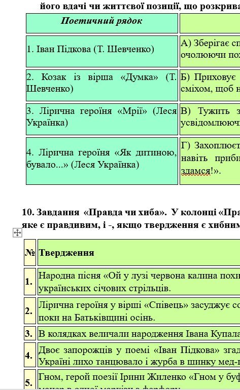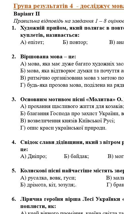 - ГР 4 – тестові завдання, завдання на встановлення відповідностей з теорії літератури та за прочитаними творами – 2 варіанти.