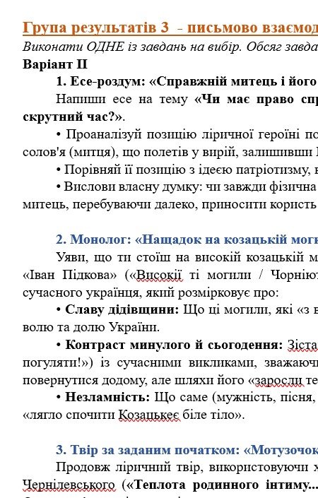 - ГР 3 – ТРИ завдання для письмової взаємодії на вибір (написання креативних творчих робіт на теми, що пов’язані з прочитаними творами) – 2 варіанти;