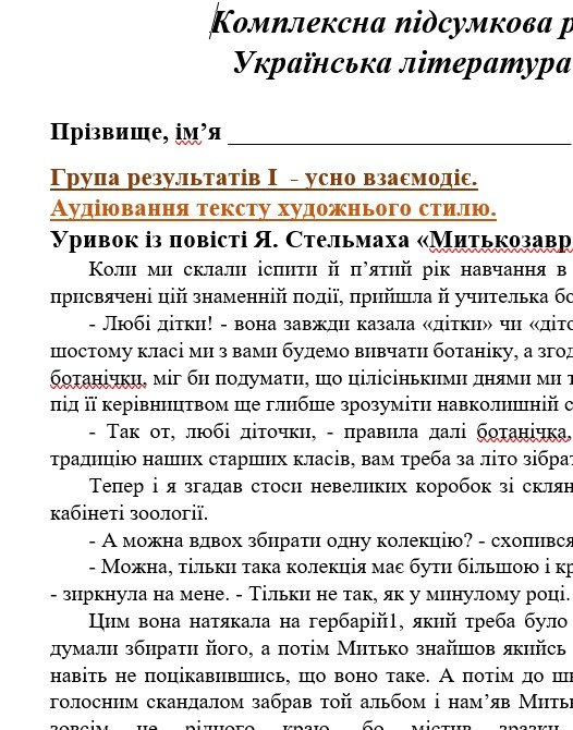 ГР 1 – аудіювання тексту художнього стилю (уривок із повісті Я. Стельмаха “итькозавр із Юрківки…”.) АБО три цікаві креативні завдання для усної взаємодії на вибір);