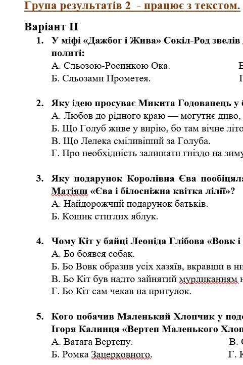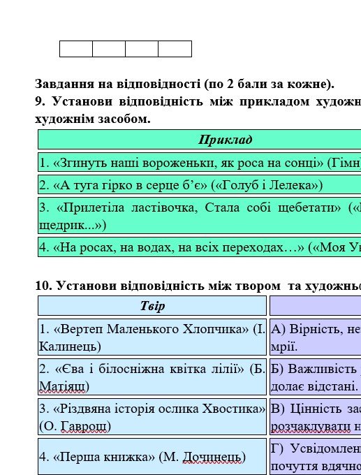 ГР 4 – тестові завдання, завдання на встановлення відповідностей з теорії літератури та за прочитаними творами – 2 варіанти.
