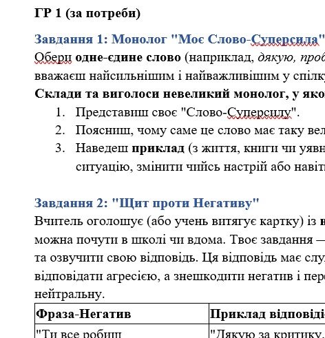 - ГР 3 – ТРИ завдання для письмової взаємодії на вибір (написання креативних творчих робіт “Щоденник добрих слів”, “Слово-чарівник і слово-колючка”, “Інструкція з безпеки для чарівних слів”);